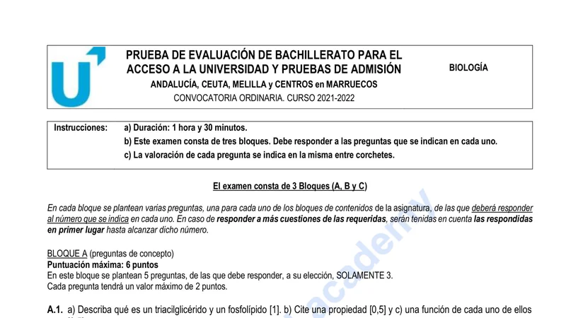 Reservar clase gratis →Examen de Biología selectividad Andalucía (Ordinaria 2022)