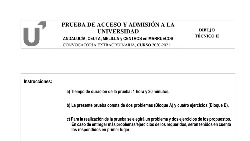 Enunciado oficial del examen de Dibujo Técnico II de la convocatoria extraordinaria de 2021 de la PEvAU/PAU de Andalucía. PDF de 0.7 MB. Descarga gratuita y sin registro. ¿Preparando la selectividad? Calcula tu nota estimada o consulta la guía completa de selectividad 2026. Encuentra todos los exámenes de Dibujo Técnico II en Andalucía o explora las 17 comunidades autónomas.
