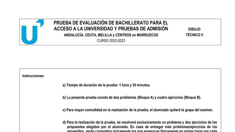 Enunciado oficial del examen de Dibujo Técnico II de la convocatoria extraordinaria de 2023 de la PEvAU/PAU de Andalucía. PDF de 0.6 MB. Descarga gratuita y sin registro. ¿Preparando la selectividad? Calcula tu nota estimada o consulta la guía completa de selectividad 2026. Encuentra todos los exámenes de Dibujo Técnico II en Andalucía o explora las 17 comunidades autónomas.