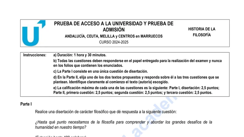 Enunciado oficial del examen de Historia de la Filosofía de la convocatoria ordinaria de 2025 de la PEvAU/PAU de Andalucía. PDF de 0.2 MB. Descarga gratuita y sin registro. ¿Preparando la selectividad? Calcula tu nota estimada o consulta la guía completa de selectividad 2026. Encuentra todos los exámenes de Historia de la Filosofía en Andalucía o explora las 17 comunidades autónomas.