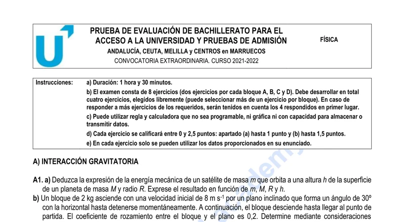 Enunciado oficial del examen de Física de la convocatoria extraordinaria de 2022 de la PEvAU/PAU de Andalucía. PDF de 0.1 MB. Descarga gratuita y sin registro. ¿Preparando la selectividad? Calcula tu nota estimada o consulta la guía completa de selectividad 2026. Encuentra todos los exámenes de Física en Andalucía o explora las 17 comunidades autónomas.