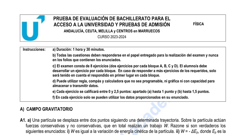 Enunciado oficial del examen de Física de la convocatoria extraordinaria de 2024 de la PEvAU/PAU de Andalucía. PDF de 0.4 MB. Descarga gratuita y sin registro. ¿Preparando la selectividad? Calcula tu nota estimada o consulta la guía completa de selectividad 2026. Encuentra todos los exámenes de Física en Andalucía o explora las 17 comunidades autónomas.