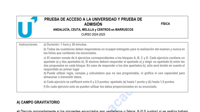 Enunciado oficial del examen de Física de la convocatoria extraordinaria de 2025 de la PEvAU/PAU de Andalucía. PDF de 0.5 MB. Descarga gratuita y sin registro. ¿Preparando la selectividad? Calcula tu nota estimada o consulta la guía completa de selectividad 2026. Encuentra todos los exámenes de Física en Andalucía o explora las 17 comunidades autónomas.