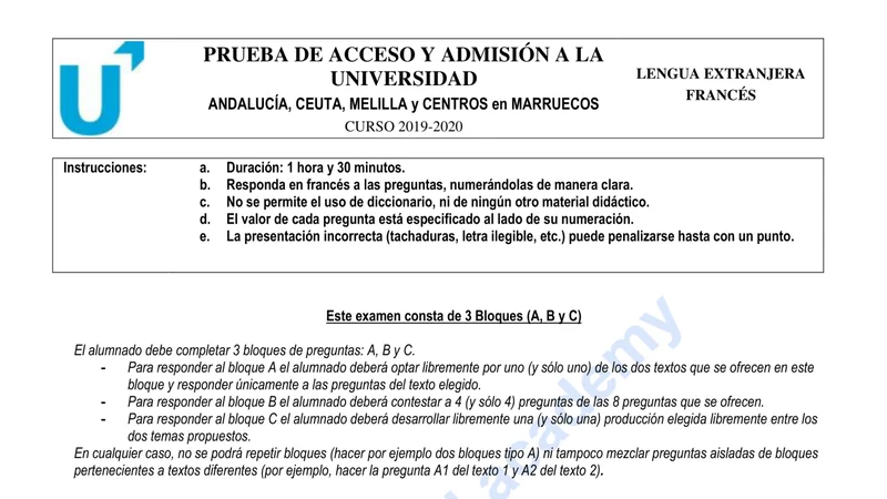 Examen PAU Francés selectividad Andalucía — Ordinaria 2020