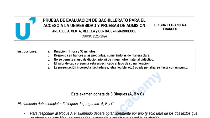 Examen PAU Francés selectividad Andalucía — Extraordinaria 2024