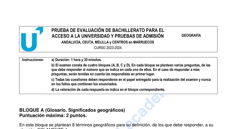 Enunciado oficial del examen de Geografía de la convocatoria ordinaria de 2024 de la PEvAU/PAU de Andalucía. PDF de 0.4 MB. Descarga gratuita y sin registro. ¿Preparando la selectividad? Calcula tu nota estimada o consulta la guía completa de selectividad 2026. Encuentra todos los exámenes de Geografía en Andalucía o explora las 17 comunidades autónomas.