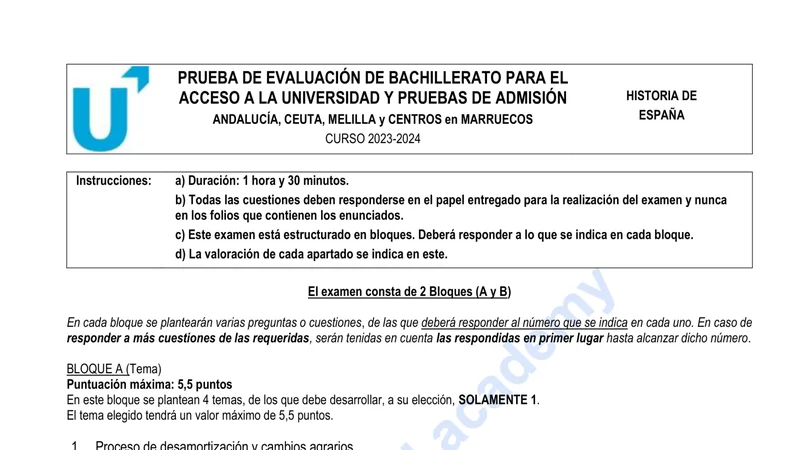 Examen PAU Historia de España selectividad Andalucía — Ordinaria 2024