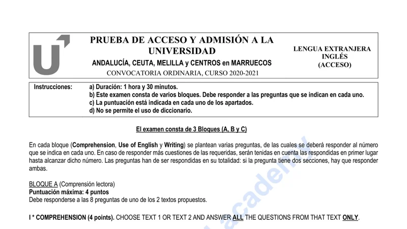 Reservar clase gratis →Examen de Inglés selectividad Andalucía (Ordinaria 2021)