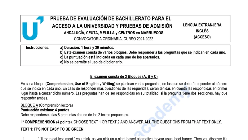 Reservar clase gratis →Examen de Inglés selectividad Andalucía (Extraordinaria 2022)