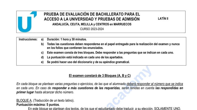 Enunciado oficial del examen de Latín II de la convocatoria extraordinaria de 2024 de la PEvAU/PAU de Andalucía. PDF de 0.1 MB. Descarga gratuita y sin registro. ¿Preparando la selectividad? Calcula tu nota estimada o consulta la guía completa de selectividad 2026. Encuentra todos los exámenes de Latín II en Andalucía o explora las 17 comunidades autónomas.