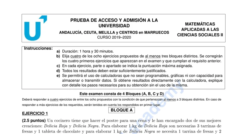Reservar clase gratis →Examen de Matemáticas Aplicadas CCSS selectividad Andalucía (Ordinaria 2020)