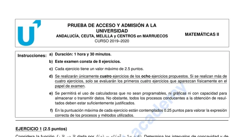 Enunciado oficial del examen de Matemáticas II de la convocatoria ordinaria de 2020 de la PEvAU/PAU de Andalucía. PDF de 0.1 MB. Descarga gratuita y sin registro. ¿Preparando la selectividad? Calcula tu nota estimada o consulta la guía completa de selectividad 2026. Encuentra todos los exámenes de Matemáticas II en Andalucía o explora las 17 comunidades autónomas.