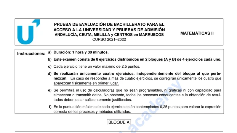 Enunciado oficial del examen de Matemáticas II de la convocatoria extraordinaria de 2022 de la PEvAU/PAU de Andalucía. PDF de 0.1 MB. Descarga gratuita y sin registro. ¿Preparando la selectividad? Calcula tu nota estimada o consulta la guía completa de selectividad 2026. Encuentra todos los exámenes de Matemáticas II en Andalucía o explora las 17 comunidades autónomas.