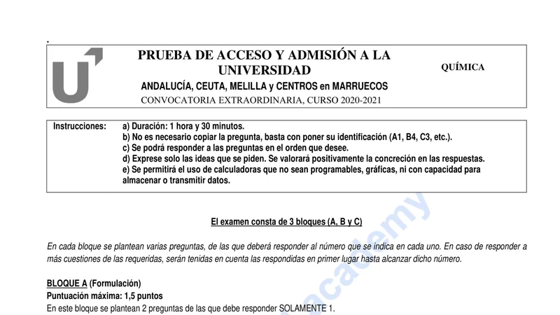 Enunciado oficial del examen de Química de la convocatoria extraordinaria de 2021 de la PEvAU/PAU de Andalucía. PDF de 0.3 MB. Descarga gratuita y sin registro. ¿Preparando la selectividad? Calcula tu nota estimada o consulta la guía completa de selectividad 2026. Encuentra todos los exámenes de Química en Andalucía o explora las 17 comunidades autónomas.