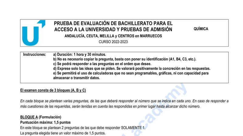 Reservar clase gratis →Examen de Química selectividad Andalucía (Ordinaria 2023)
