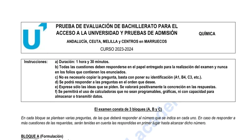 Enunciado oficial del examen de Química de la convocatoria ordinaria de 2024 de la PEvAU/PAU de Andalucía. PDF de 0.4 MB. Descarga gratuita y sin registro. ¿Preparando la selectividad? Calcula tu nota estimada o consulta la guía completa de selectividad 2026. Encuentra todos los exámenes de Química en Andalucía o explora las 17 comunidades autónomas.