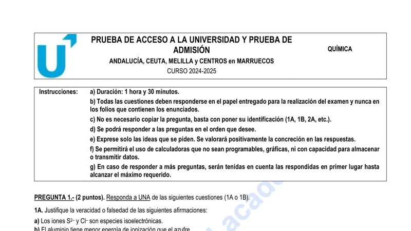 Enunciado oficial del examen de Química de la convocatoria ordinaria de 2025 de la PEvAU/PAU de Andalucía. PDF de 0.5 MB. Descarga gratuita y sin registro. ¿Preparando la selectividad? Calcula tu nota estimada o consulta la guía completa de selectividad 2026. Encuentra todos los exámenes de Química en Andalucía o explora las 17 comunidades autónomas.