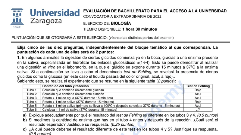Reservar clase gratis →Examen de Biología selectividad Aragón (Extraordinaria 2022)