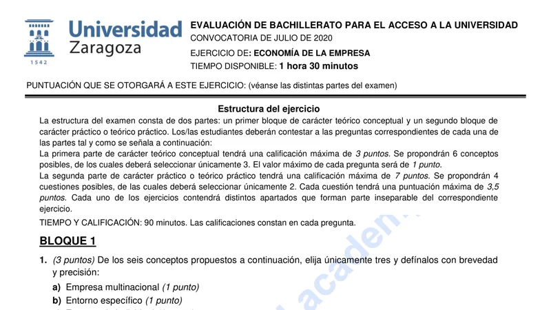 Reservar clase gratis →Examen de Economía de la Empresa selectividad Aragón (Ordinaria 2020)