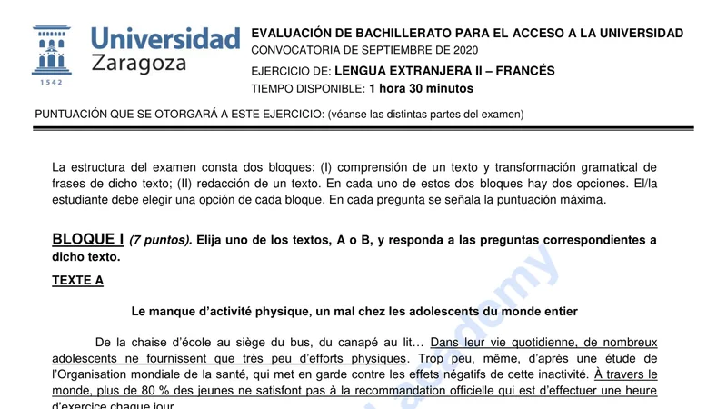 Examen de Francés selectividad Aragón — Extraordinaria 2020
