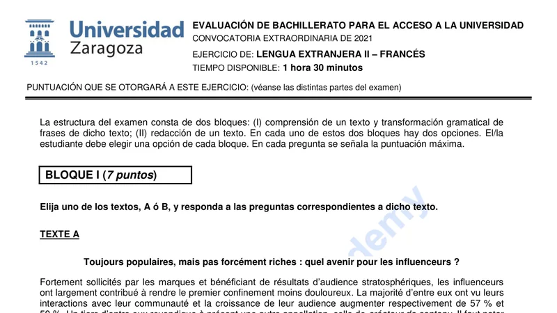Examen de Francés selectividad Aragón — Extraordinaria 2021