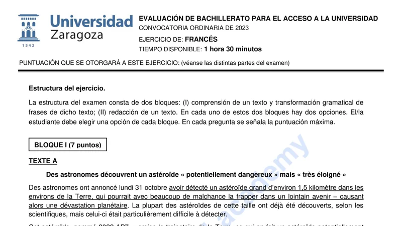 Examen de Francés selectividad Aragón — Ordinaria 2023
