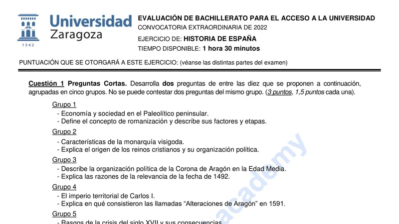 Reservar clase gratis →Examen de Historia de España selectividad Aragón (Extraordinaria 2022)