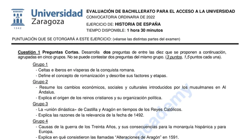 Reservar clase gratis →Examen de Historia de España selectividad Aragón (Ordinaria 2022)