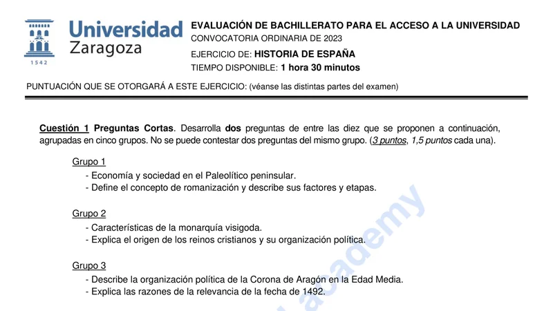 Reservar clase gratis →Examen de Historia de España selectividad Aragón (Ordinaria 2023)