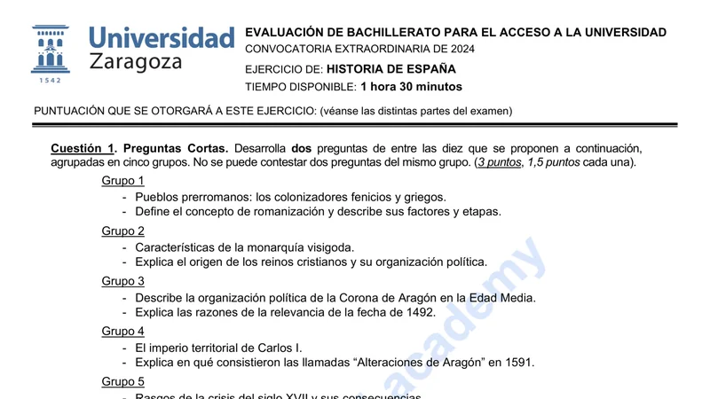 Reservar clase gratis →Examen de Historia de España selectividad Aragón (Extraordinaria 2024)