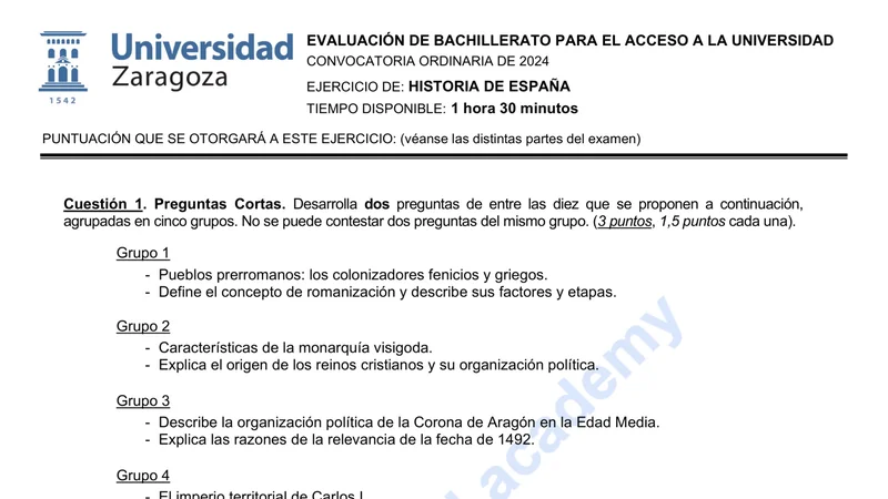 Reservar clase gratis →Examen de Historia de España selectividad Aragón (Ordinaria 2024)