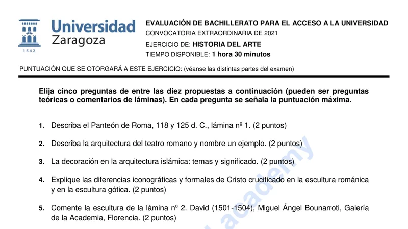 Examen PAU Historia del Arte selectividad Aragón — Extraordinaria 2021