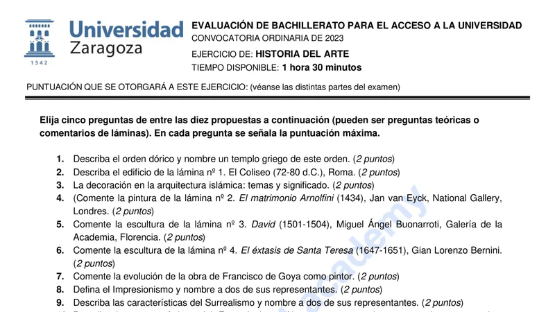 Examen PAU Historia del Arte selectividad Aragón — Ordinaria 2023