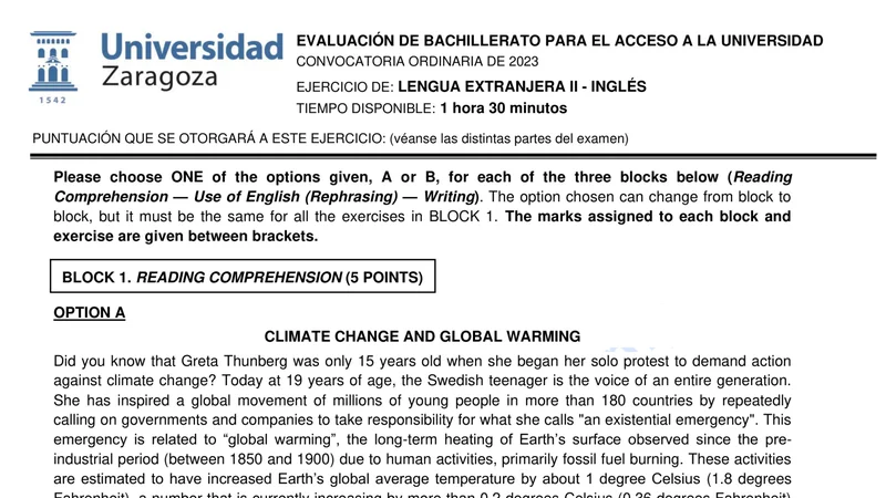 Reservar clase gratis →Examen de Inglés selectividad Aragón (Ordinaria 2023)