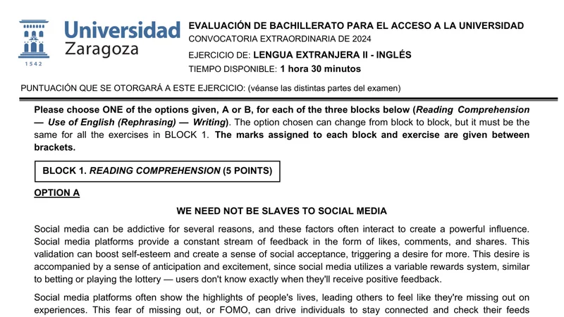 Reservar clase gratis →Examen de Inglés selectividad Aragón (Extraordinaria 2024)