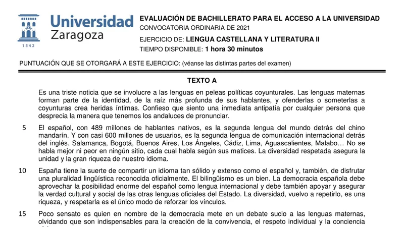 Examen de Lengua Castellana y Literatura selectividad Aragón — Ordinaria 2021