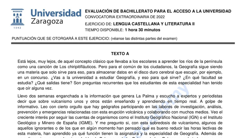 Examen PAU Lengua Castellana selectividad Aragón — Extraordinaria 2022
