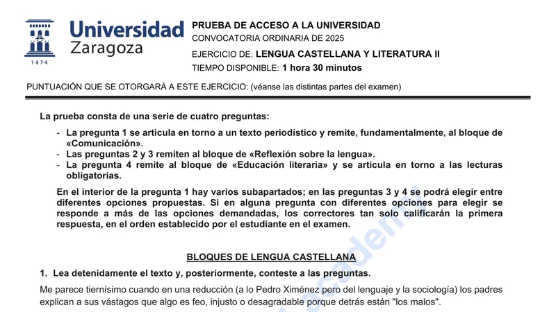 Reservar clase gratis →Examen de Lengua Castellana selectividad Aragón (Ordinaria 2025)