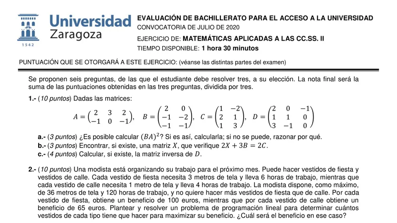 Examen de Matemáticas CCSS selectividad Aragón — Ordinaria 2020