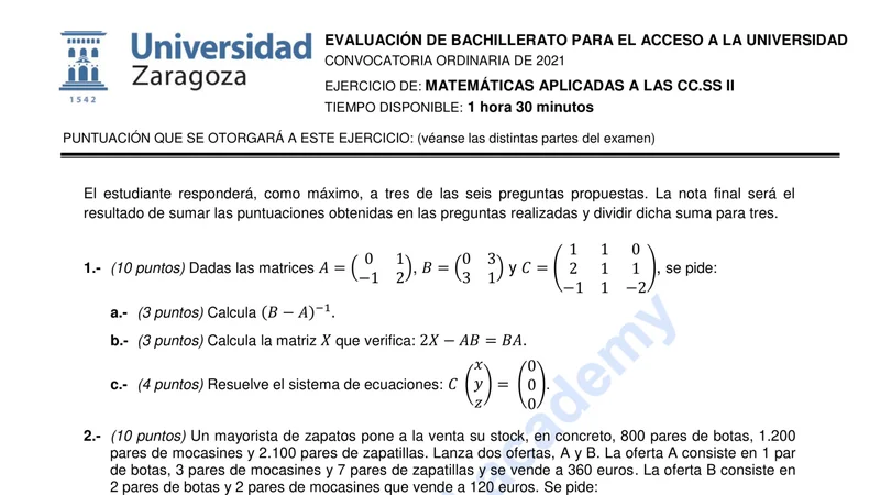 Reservar clase gratis →Examen de Matemáticas Aplicadas CCSS selectividad Aragón (Ordinaria 2021)
