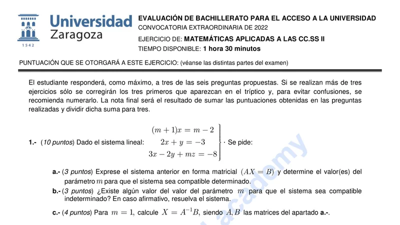 Reservar clase gratis →Examen de Matemáticas CCSS selectividad Aragón (Extraordinaria 2022)