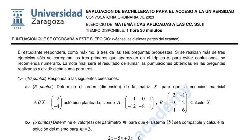 Reservar clase gratis →Examen de Matemáticas Aplicadas CCSS selectividad Aragón (Ordinaria 2023)