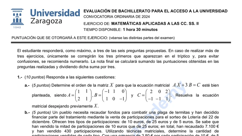 Examen de Matemáticas CCSS selectividad Aragón — Ordinaria 2024