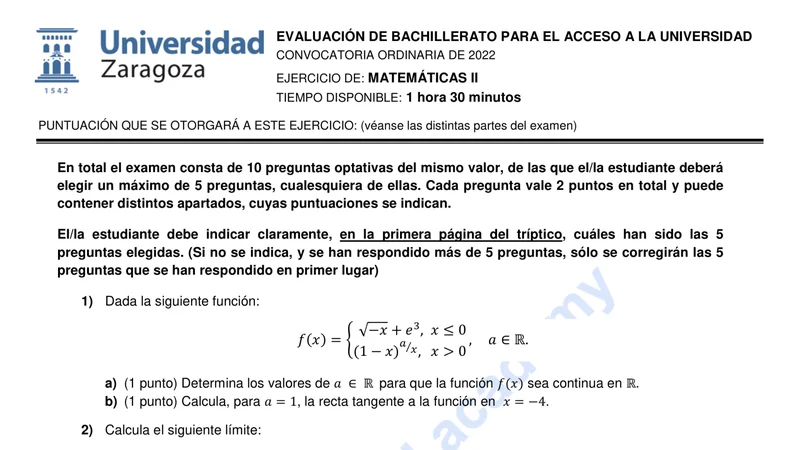 Reservar clase gratis →Examen de Matemáticas II selectividad Aragón (Ordinaria 2022)