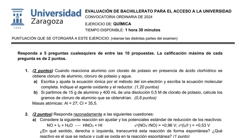 Reservar clase gratis →Examen de Química selectividad Aragón (Ordinaria 2024)