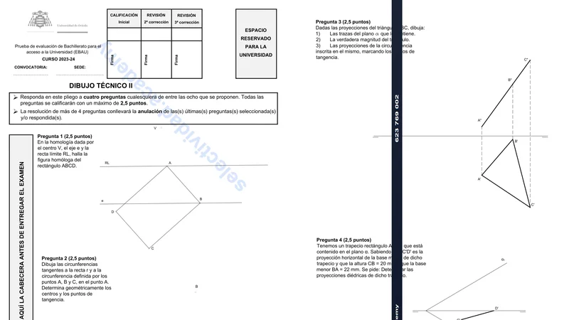Enunciado oficial del examen de Dibujo Técnico II de la convocatoria ordinaria de 2024 de la EBAU/PAU de Asturias. PDF de 0.4 MB. Descarga gratuita y sin registro. ¿Preparando la selectividad? Calcula tu nota estimada o consulta la guía completa de selectividad 2026. Encuentra todos los exámenes de Dibujo Técnico II en Asturias o explora las 17 comunidades autónomas.