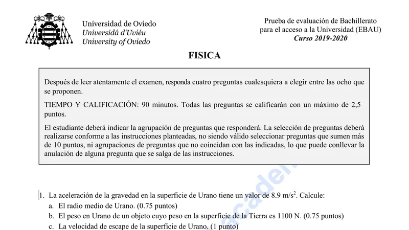 Enunciado oficial del examen de Física de la convocatoria extraordinaria de 2020 de la EBAU/PAU de Asturias. PDF de 0.4 MB. Descarga gratuita y sin registro. ¿Preparando la selectividad? Calcula tu nota estimada o consulta la guía completa de selectividad 2026. Encuentra todos los exámenes de Física en Asturias o explora las 17 comunidades autónomas.