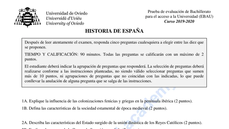 Reservar clase gratis →Examen de Historia de España selectividad Asturias (Ordinaria 2020)
