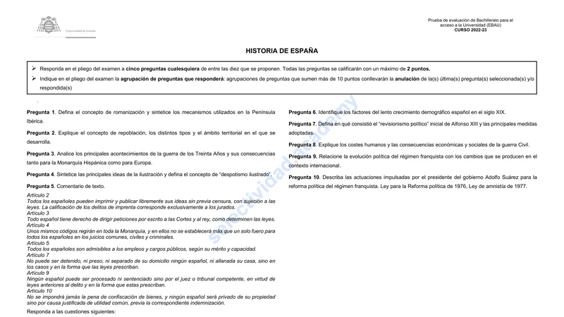 Examen de Historia de España selectividad Asturias — Ordinaria 2023