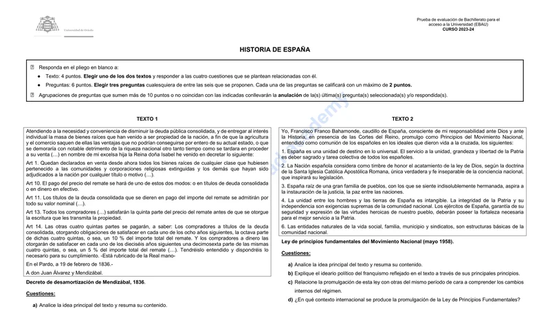Enunciado oficial del examen de Historia de España de la convocatoria extraordinaria de 2024 de la EBAU/PAU de Asturias. PDF de 0.1 MB. Descarga gratuita y sin registro. ¿Preparando la selectividad? Calcula tu nota estimada o consulta la guía completa de selectividad 2026. Encuentra todos los exámenes de Historia de España en Asturias o explora las 17 comunidades autónomas.